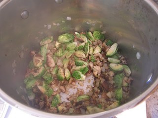 Later that night I got started on Quinoa Soup; onions, garlic, mushrooms, brussel sprouts, quinoa, veggie broth and a jar of my home canned tomatoes.