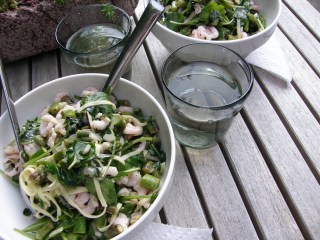 Our last dinner on the coast, pasta, shrimp, asparagus, garlic, and arugula topped w/ fresh basil.