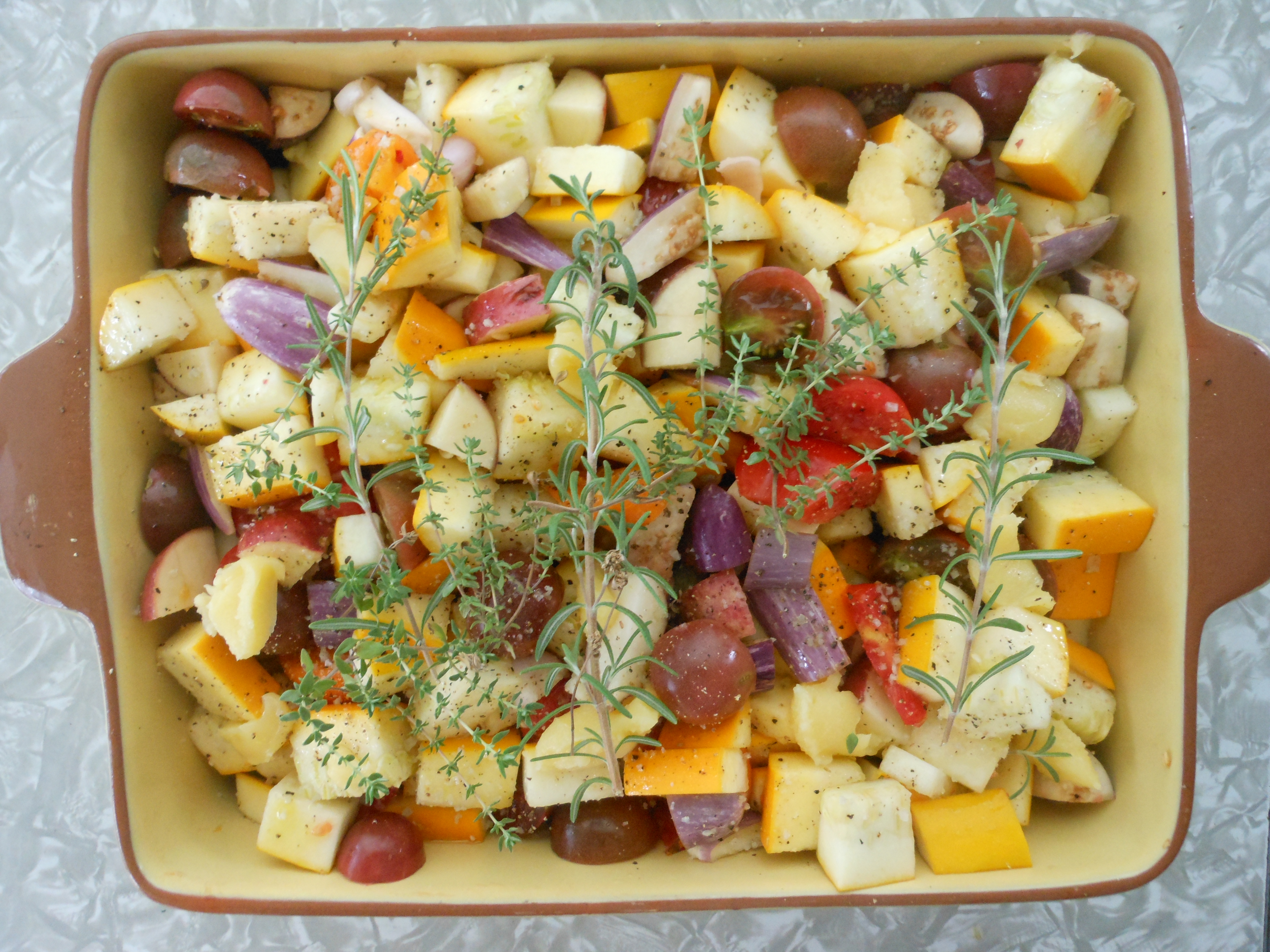 2. Place all the chopped veggies in a your favorite baking dish. I used my big yellow one that is really deep, when I made my Gluten-free Strawberry Rhubarb Cobbler it held 15 cups of fruit! So used a big baking dish.