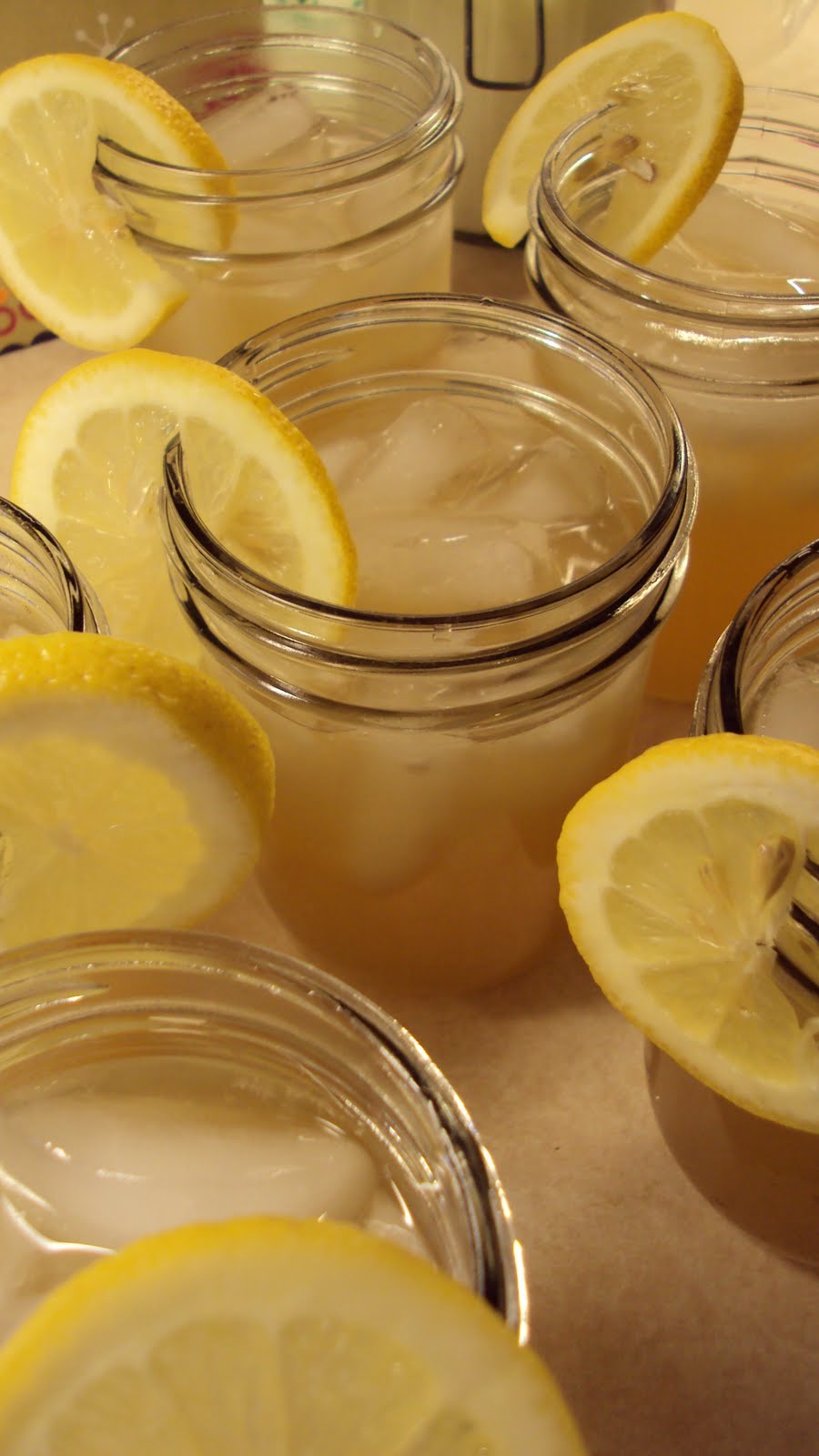 ice, drinking glass, paper straws, slices of peaches (whiskey) slices of lemon and cucumber (vodka)
