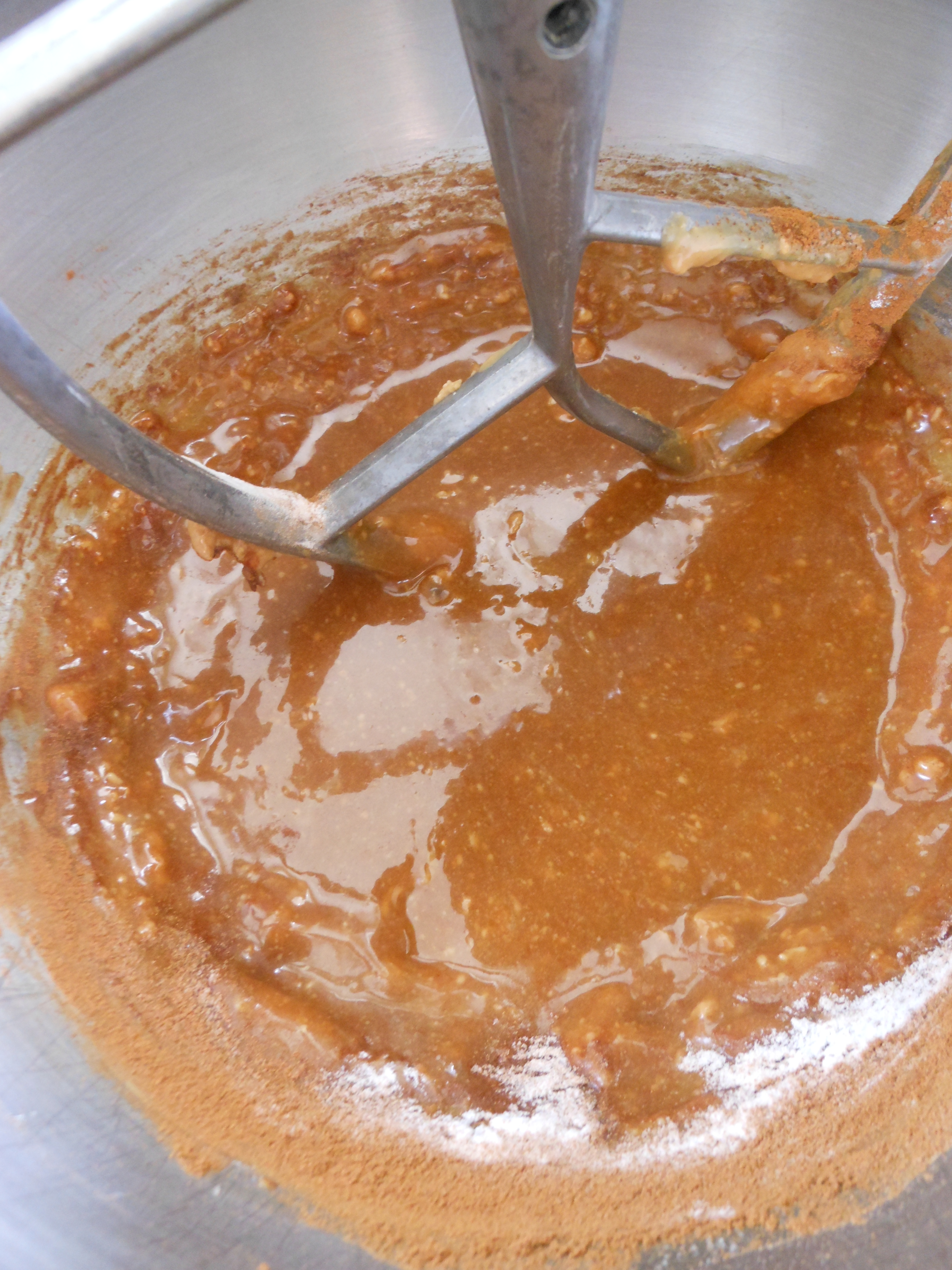 2. Next add salt, baking soda, cinnamon, mix well. Next add oat flour, oats, chocolate chunks and walnuts until well mixed.